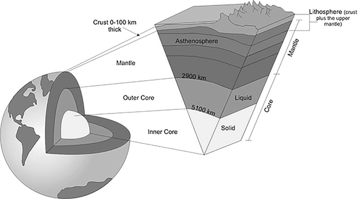• This allowed heavier materials (like iron) to sink towards the centre of the earth and the lighter ones to move towards the surface. With passage of time it cooled further and solidified and condensed into a smaller size. This later led to the development of the outer surface in the form of a crust.
